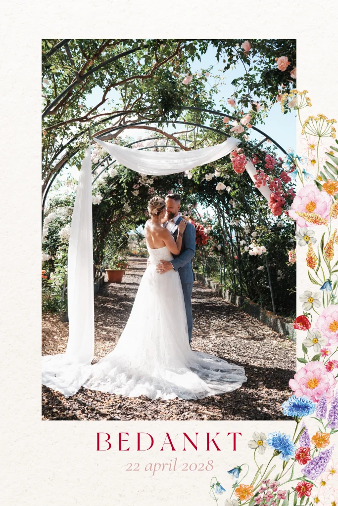 Kleurrijke foto bedankkaart met bloemenrand rood blauw
