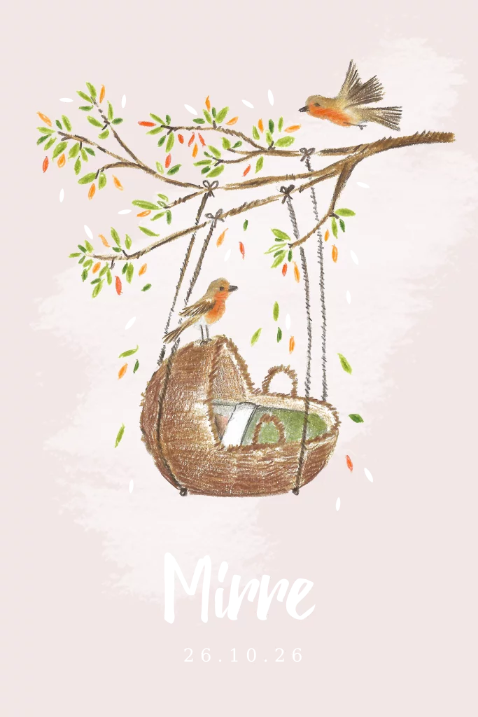 Op zoek naar een origineel getekend geboortekaartje afgewerkt met roségoud folie? Dan is dit lieve kaartje geïllustreerd met een wiegje hangend aan een tak door Marjolein perfect voor jullie kleine meisje! Uniek, vrolijk en ontzettend lief.