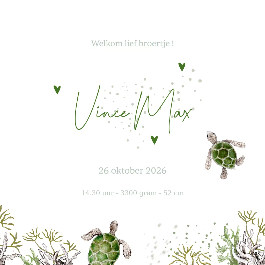 Op zoek naar een origineel getekend geboortekaartje voor een tweede kindje? Dan is dit lieve kaartje geïllustreerd met een schildpadjes door Marjolein perfect voor jullie kleine meisje!