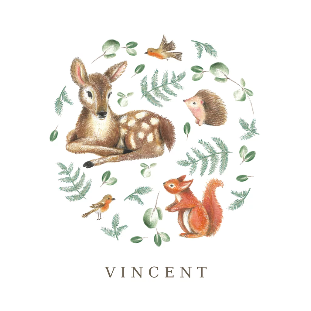 Op zoek naar een origineel getekend geboortekaartje? Dan is dit lieve kaartje geïllustreerd met bosdieren door Marjolein perfect voor jullie kleine ventje! Uniek, vrolijk en ontzettend lief.
