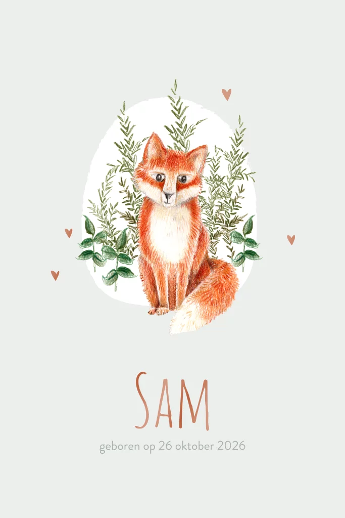 Op zoek naar een origineel getekend geboortekaartje? Dan is dit kaartje geïllustreerd met een vosje en afgewerkt met hoogglans door Marjolein perfect voor jullie jongen! Uniek, vrolijk en ontzettend lief.