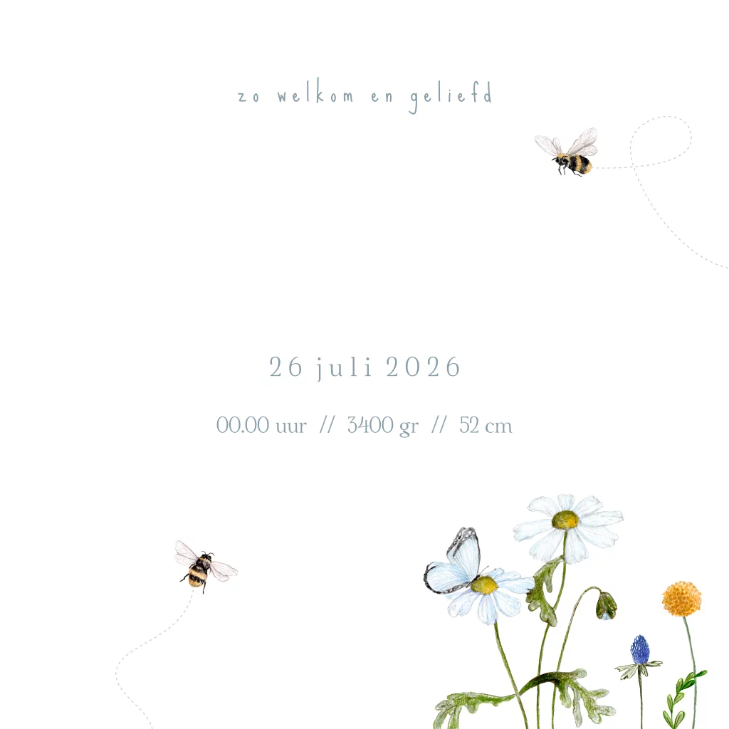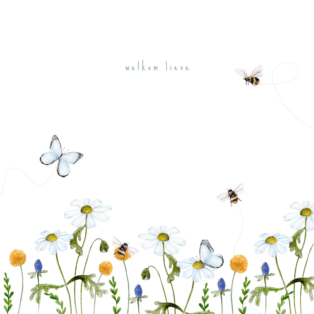 Op zoek naar een origineel getekend geboortekaartje? Dan is dit lieve kaartje geïllustreerd met bloemen, bijtjes en vlinders perfect voor jullie kleine ventje!