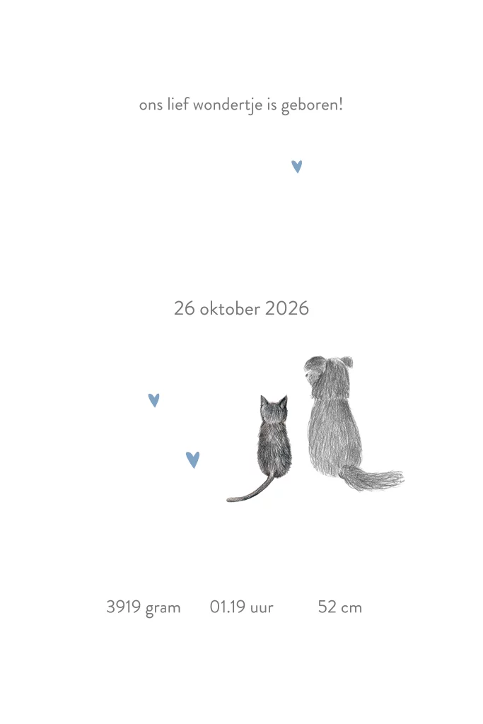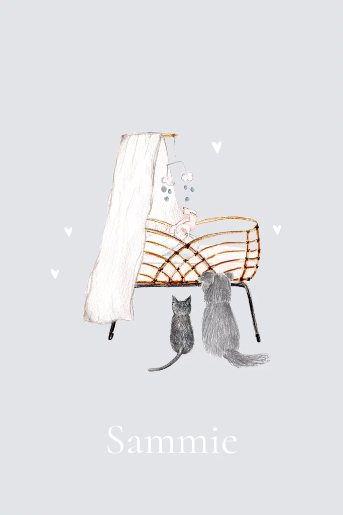 Op zoek naar een origineel getekend geboortekaartje? Dan is dit kaartje geïllustreerd met een wiegje en huisdieren afgewerkt met zilverfolie door Marjolein perfect voor jullie jongen! Uniek, vrolijk en ontzettend lief.