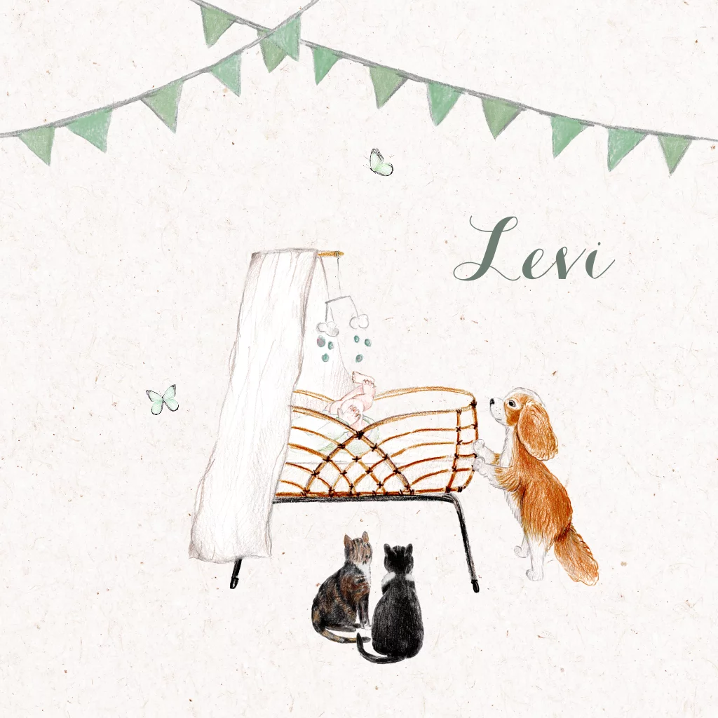 Op zoek naar een origineel getekend geboortekaartje? Dan is dit lieve kaartje geïllustreerd met wiegje met baby en vlaggetjes door Marjolein perfect voor jullie kleine meisje! Uniek, vrolijk en ontzettend lief.