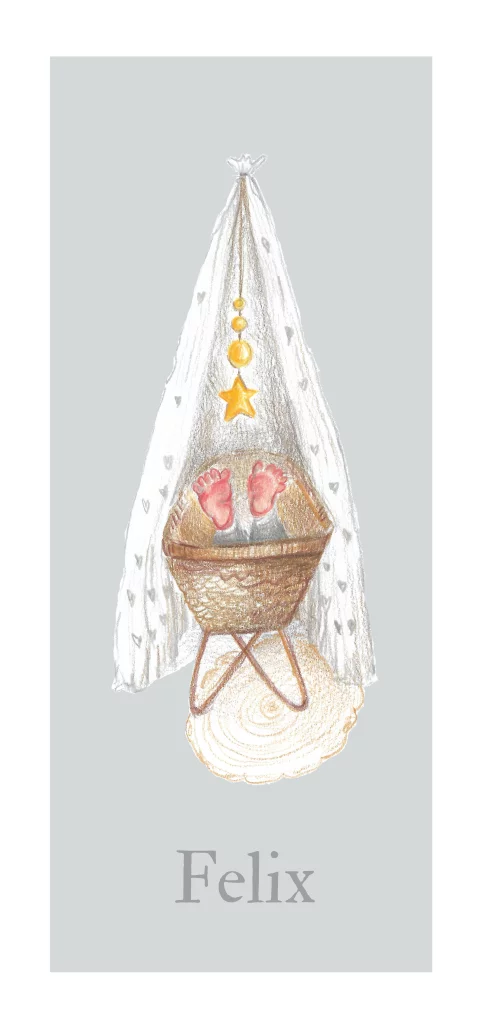Op zoek naar een origineel getekend geboortekaartje? Dan is dit lieve kaartje geïllustreerd met wiegje met stermobiel door Marjolein perfect voor jullie kleine ventje! Uniek, vrolijk en ontzettend lief.
