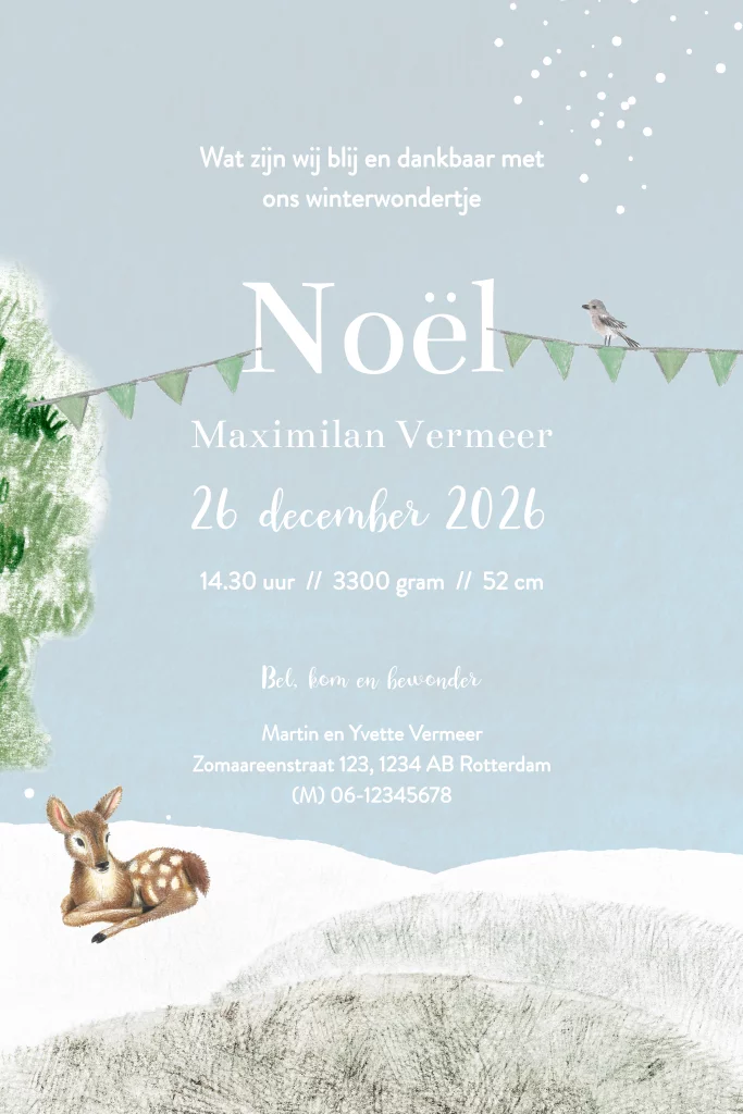 Op zoek naar een origineel getekende geboortekaart? Dan is dit geboortekaartje geïllustreerd met een winterlandschap perfect voor jullie kleine jongen!