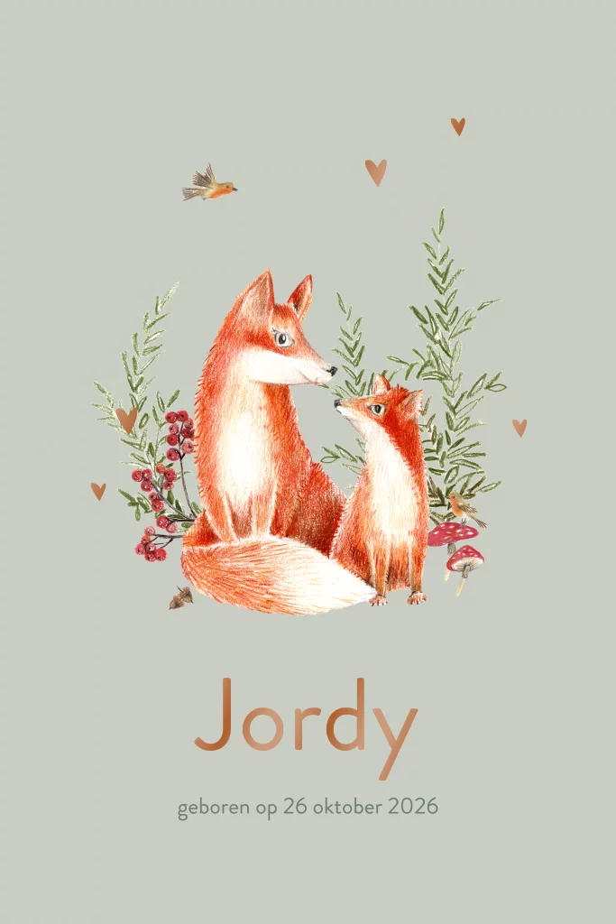 Op zoek naar een origineel getekend geboortekaartje in herfst thema? Dit lieve kaartje geïllustreerd met vosjes en afgewerkt met hoogglans is perfect voor jullie jongen.