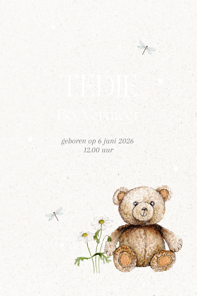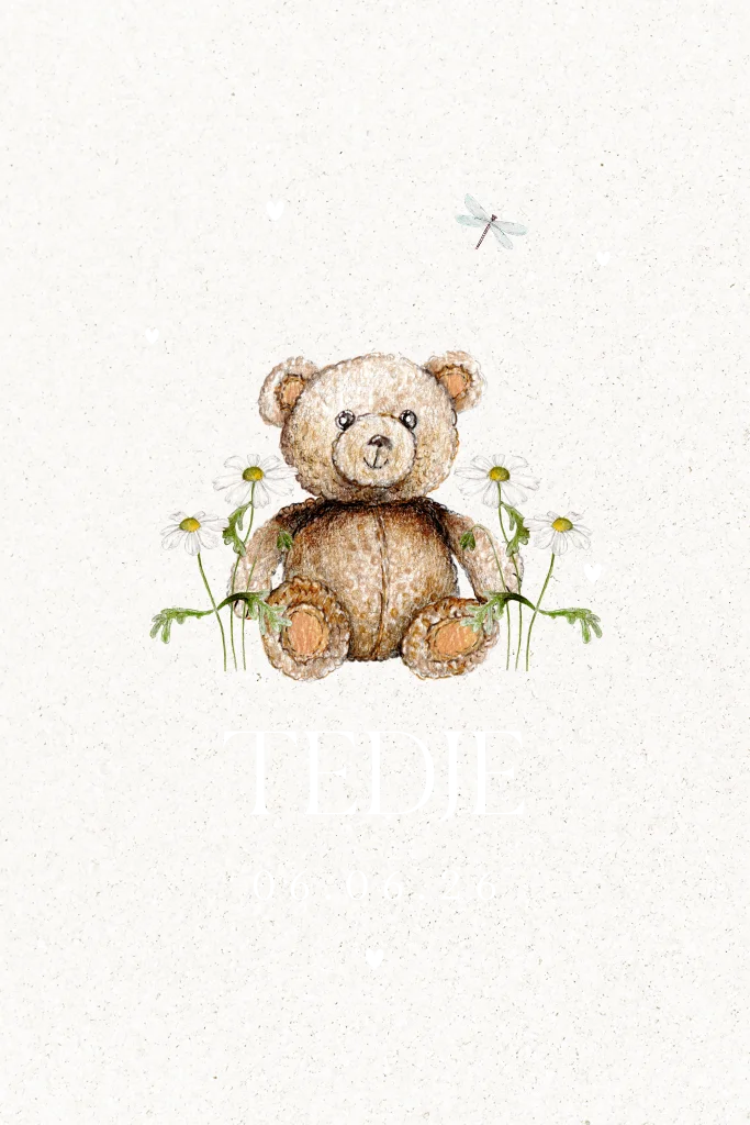 Dit dubbele geboortekaartje met teddybeer, madeliefjes en libelle straalt zachtheid en warmte uit. De lieve illustratie van het beertje tussen de fijne madeliefjes zorgt voor een dromerige, natuurlijke sfeer. De subtiele libelle en kleine hartjes geven het ontwerp een speels en verfijnd accent.