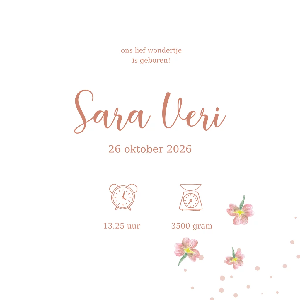Op zoek naar een origineel getekend geboortekaartje? Dan is dit lieve kaartje geïllustreerd met bloemetjes door Marjolein perfect voor jullie! Uniek, vrolijk en ontzettend lief.