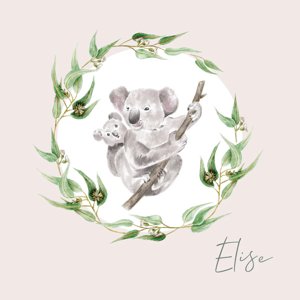Op zoek naar een origineel getekend geboortekaartje? Dan is dit lieve kaartje geïllustreerd met een koala en eucalyptus krans door Marjolein perfect voor jullie kleine meisje! Uniek, vrolijk en ontzettend lief.