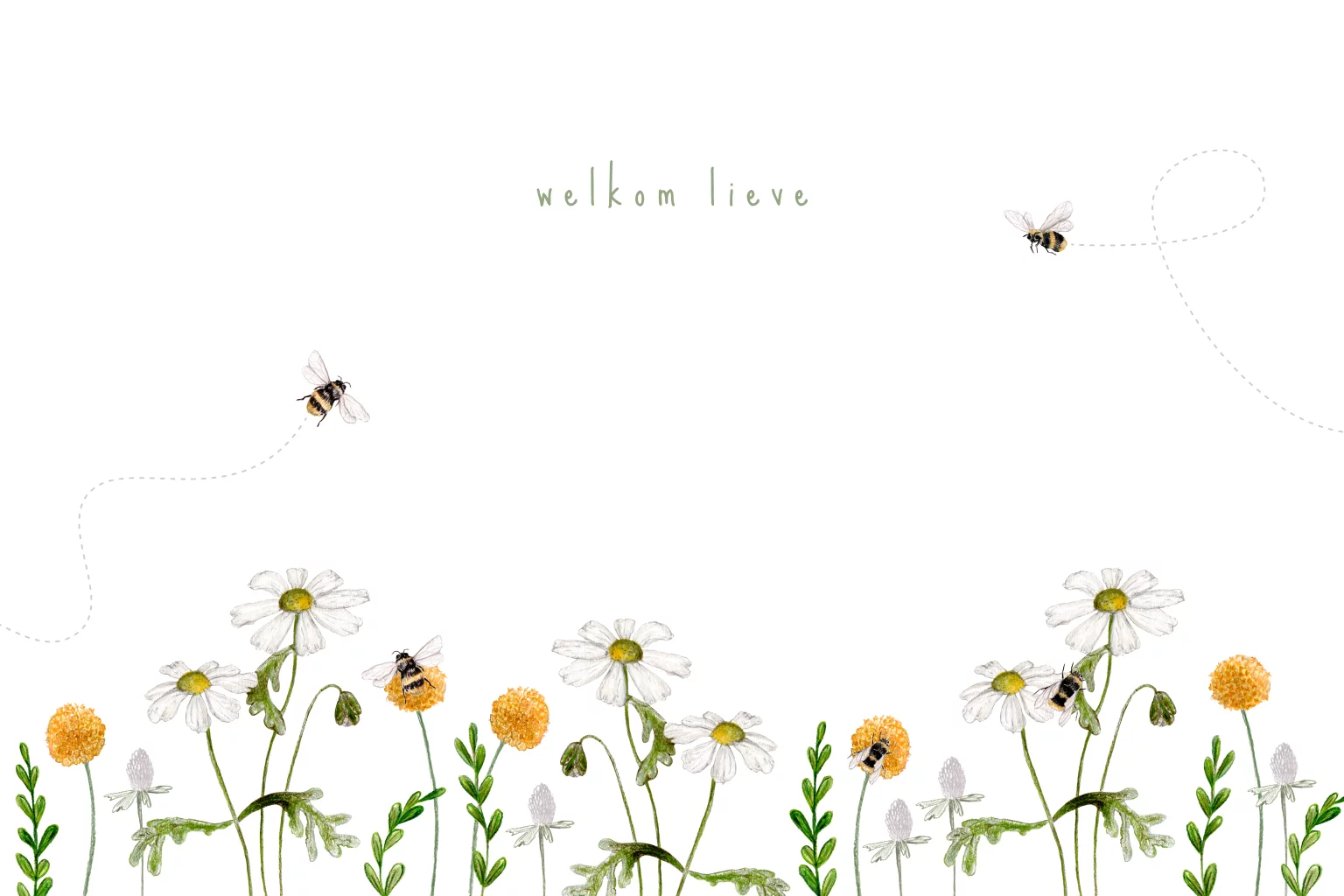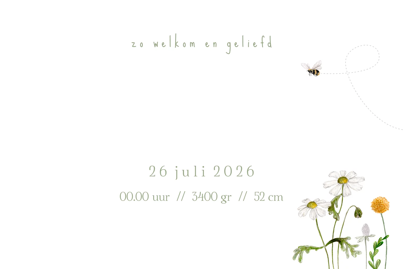 Ben je op zoek naar een prachtige, originele geboortekaart? Deze lieve kaart, geïllustreerd met bloemen, bijen en vlinders, is perfect voor je kleine meisje! Uniek, vrolijk en heel schattig. Tips van Marjolein: Deze geboortekaart staat mooi bij het linnen papiertype. Stuur de kaart stijlvol op en kies een witte envelop met een gouden inleg. Maak de verzending compleet en seal de envelop met een geboortestempel. Pas het ontwerp van de kaart eenvoudig naar eigen wens aan met onze editor. Voeg zelf eenvoudig elementen toe of verwijder ze weer. Er is keuze uit prachtige afbeeldingen, clipart en fonts. Met een andere font of achtergrond creëer je meteen een heel andere look. Lukt het je niet? Neem dan gerust contact met ons op.