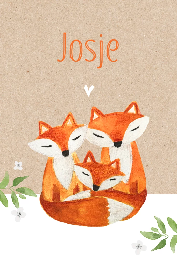 Geboortekaartje voor een jongen met een vosjes familie getekend door marjolein op een kraftlook achtergrond met takjes