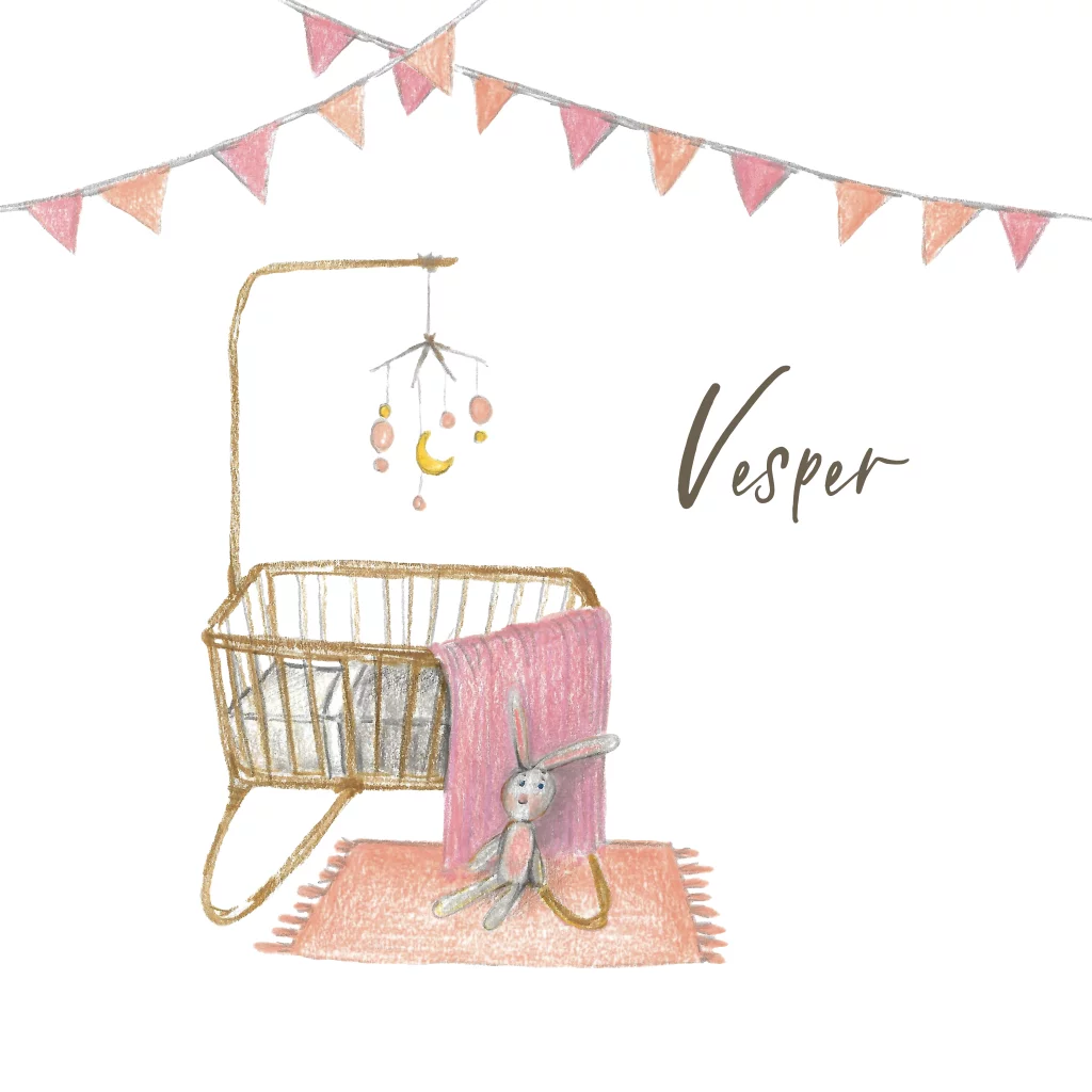 Op zoek naar een origineel getekend geboortekaartje? Dan is dit lieve kaartje geïllustreerd met wiegje met vlaggetjes door Marjolein perfect voor jullie kleine meisje! Uniek, vrolijk en ontzettend lief.