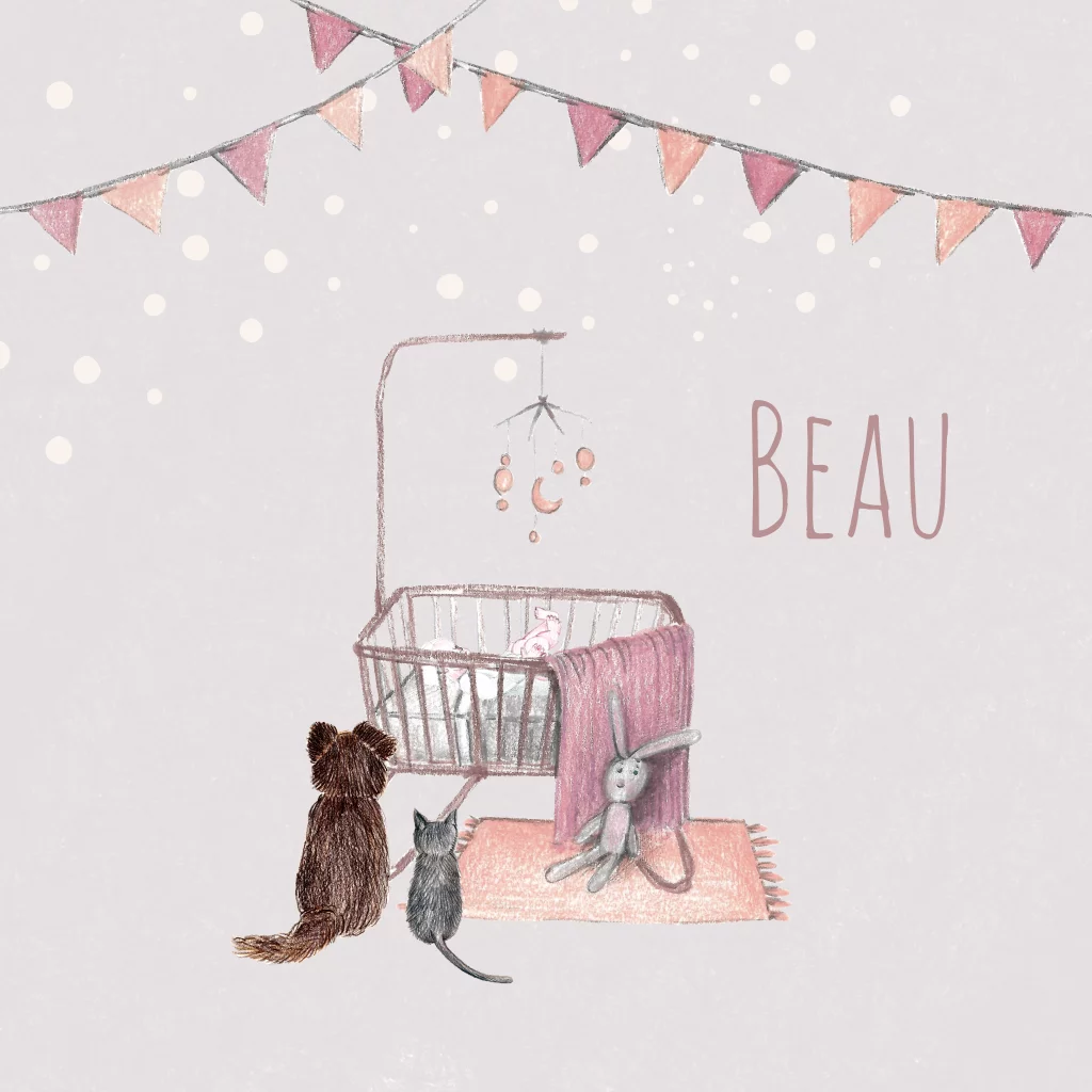 Op zoek naar een origineel getekend geboortekaartje? Dan is dit lieve kaartje geïllustreerd met wiegje met baby en vlaggetjes door Marjolein perfect voor jullie kleine meisje! Uniek, vrolijk en ontzettend lief.