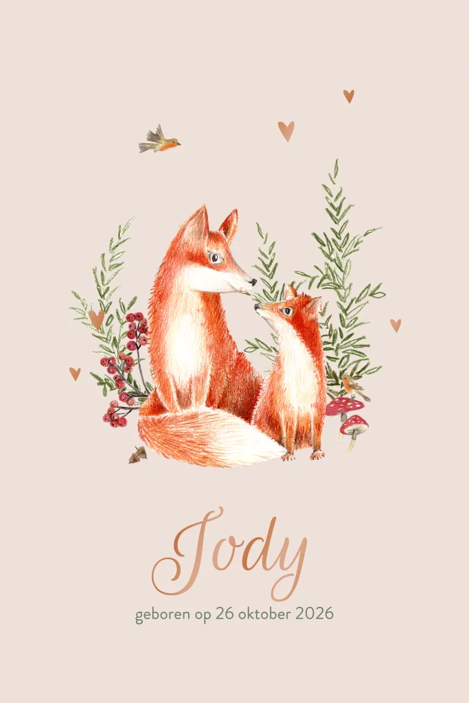 Op zoek naar een origineel getekend geboortekaartje in herfst thema? Dit lieve kaartje geïllustreerd met vosjes en afgewerkt met hoogglans is perfect voor jullie meisje.