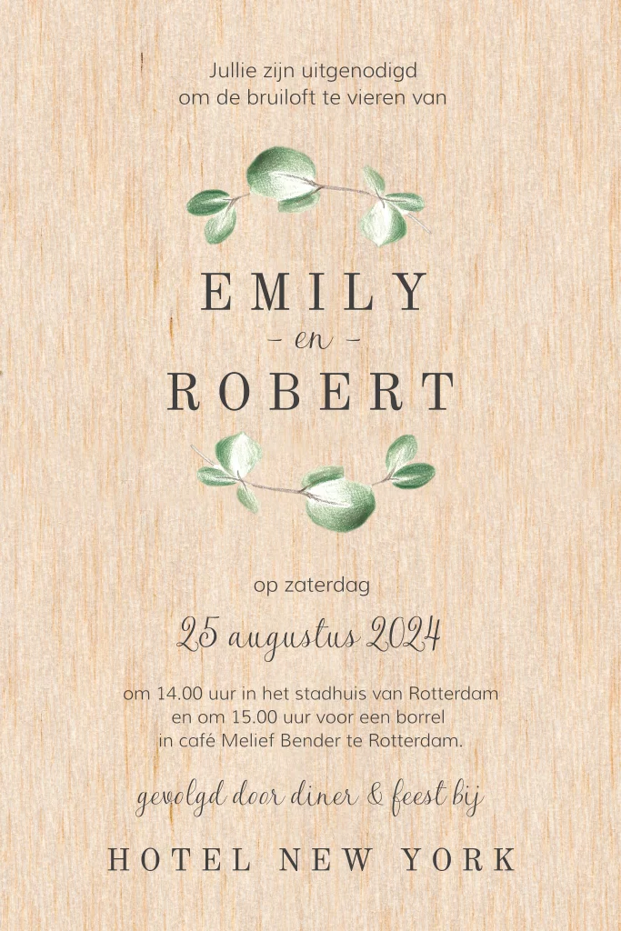 Houten trouwkaart met getekende blaadjes. Sla het op in je account om het later weer te bekijken en te bewerken. Vragen of kom je er niet uit? Neem contact met ons op!