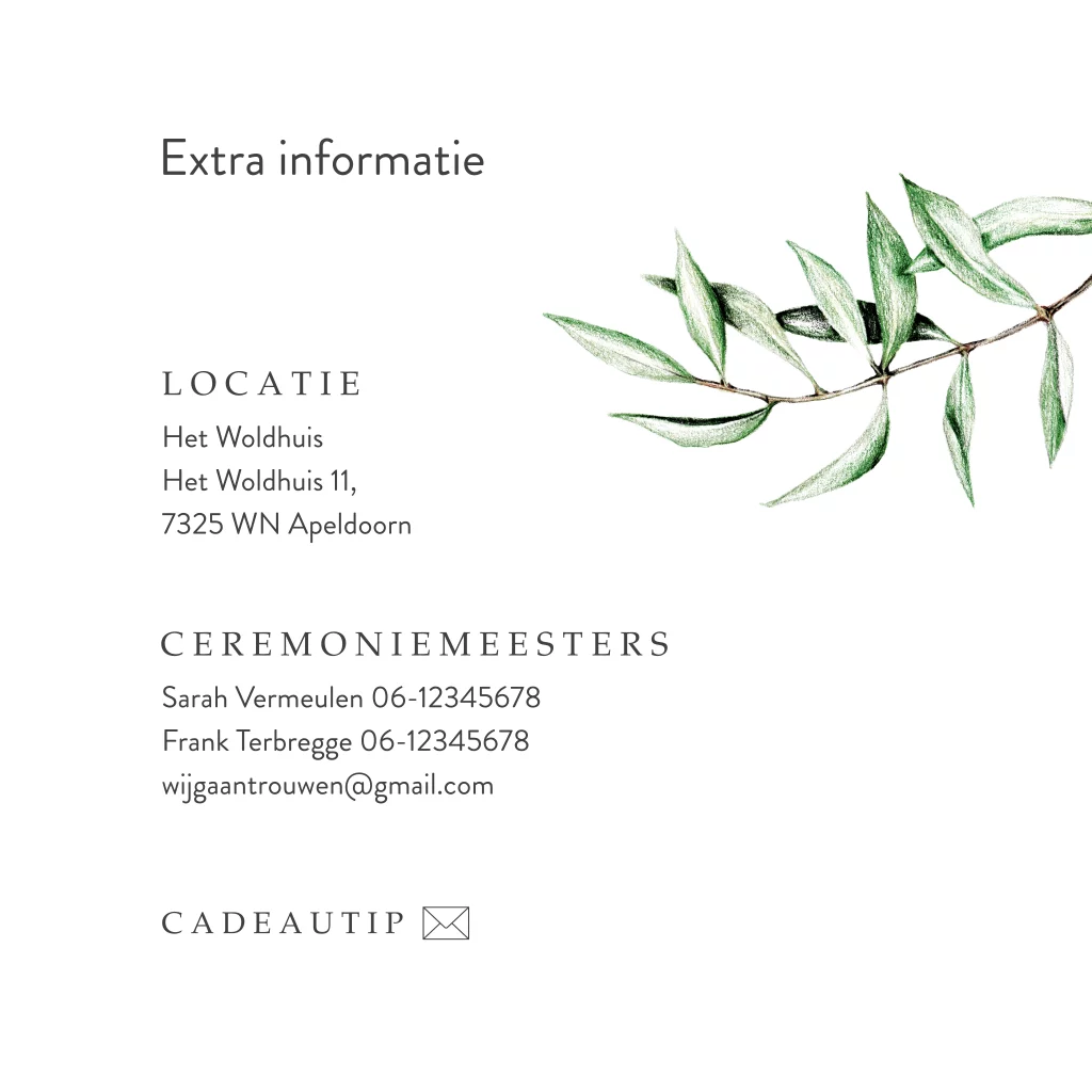 Extra informatie kaartje groen olijftakje. Gebruik dit kaartje bij je trouwkaart om zo extra informatie aan jullie gasten te geven. Leuk met een lint of een touwtje om het verzendklaar te maken.