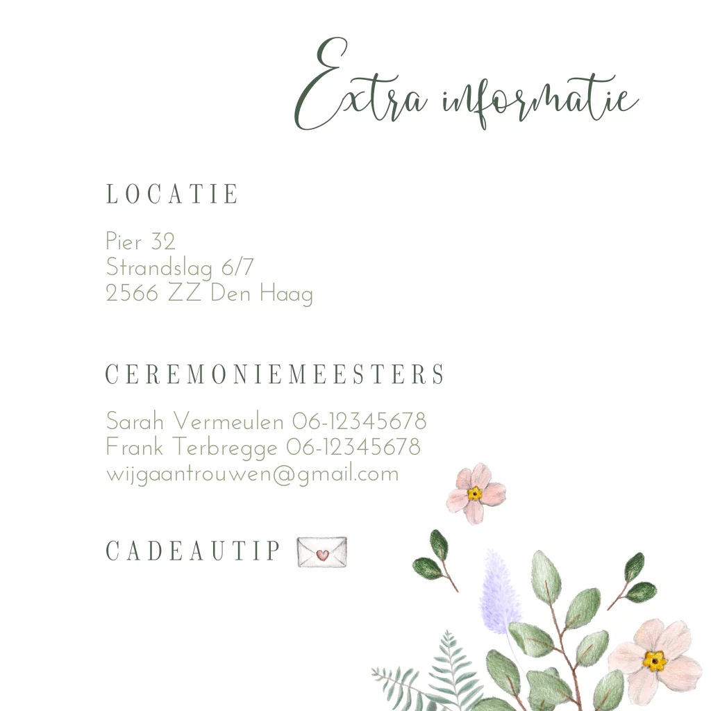 Extra informatie kaartje romantisch met pastel bloemen en blaadjes. Gebruik dit kaartje bij je trouwkaart om zo extra informatie aan jullie gasten te geven. Leuk met een lint of een touwtje om het verzendklaar te maken.