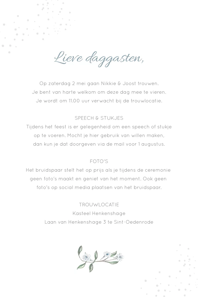 Romantische inlegvel bijbehorend bij de serie Krans blauwe bloemetjes. De subtiele bloemetjes en kleine hartjes maken dit kaartje af. De afgeronde hoeken geven het een moderne twist.