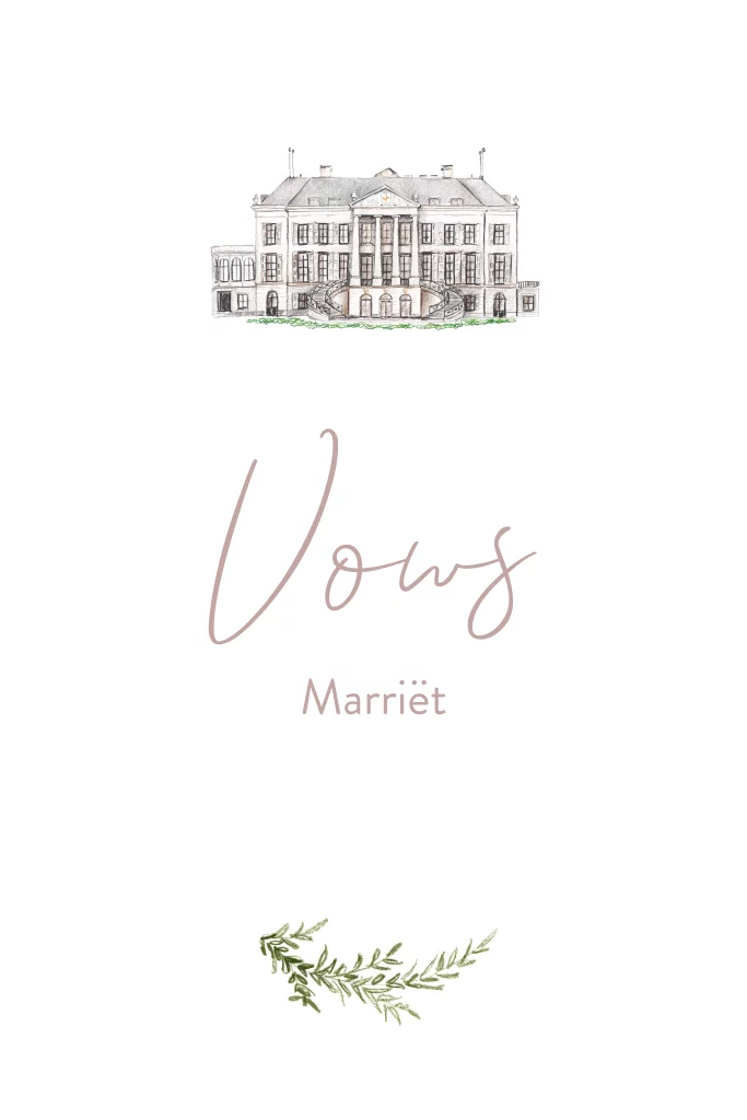 Geloftekaart stijlvolle trouwlocatie Makkelijk je eigen kaart aanpassen met de editor naar een andere kleur door de achtergrond aan te passen. De kaart in een ander formaat? Heb je een bijpassend kaartje nodig? Het is allemaal mogelijk! Mail of bel en ik help je verder.