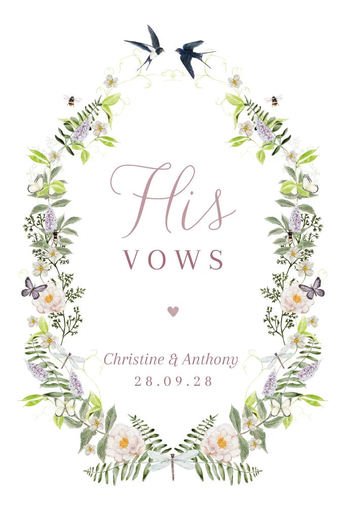 Geloften boekje man met originele vorm en botanisch krans met vogeltjes