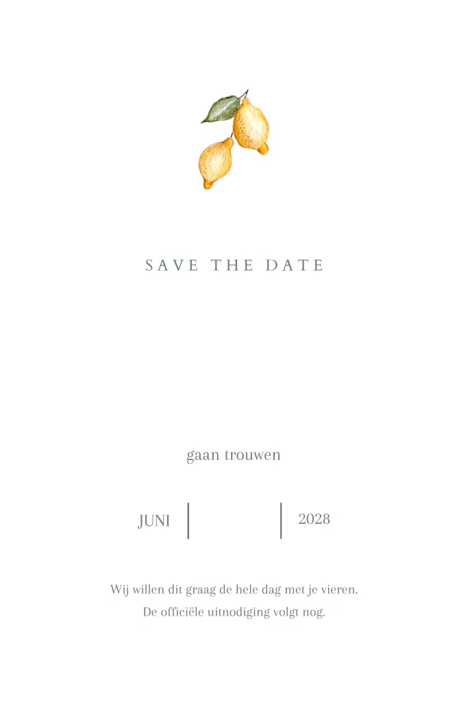 Save the date kaart van kalkpapier met citroentjes en goudfolie. Handgetekend en chique!