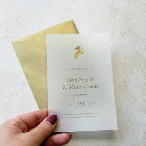 Save the date kaart van kalkpapier met getekende citroentjes en goudfolie. Handgetekend en chique!| Totaalprijs: 0 |