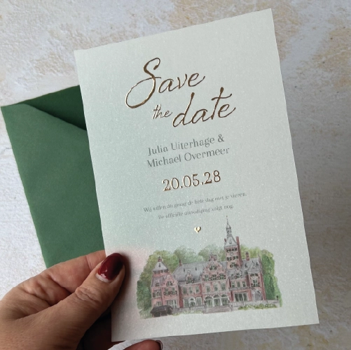 Save the date kaart op kalkpapier met trouwlocatie en rosefolie. Chique en modern!