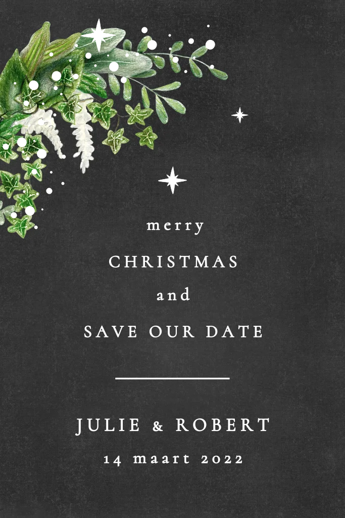 Kerst Save the date kaart met getekende botanische krans met goudfolie. Modern, handgetekend, tijdloos en chique!
