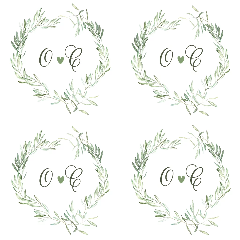 Kleine labels met Chique sierlijke olijftakjes, stijlvolle groene kleuren in combinatie met een sierlijk lettertype. Chique en stijlvol!