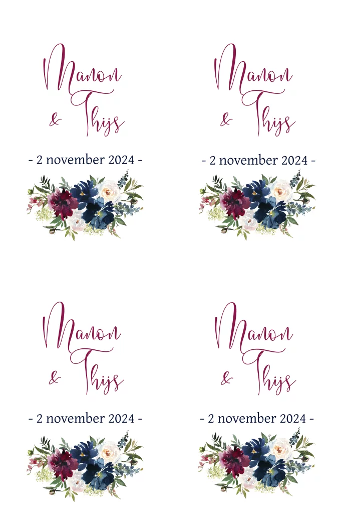 Modern labeltje met donkerblauwe bordeauxrode aquarel bloemen.