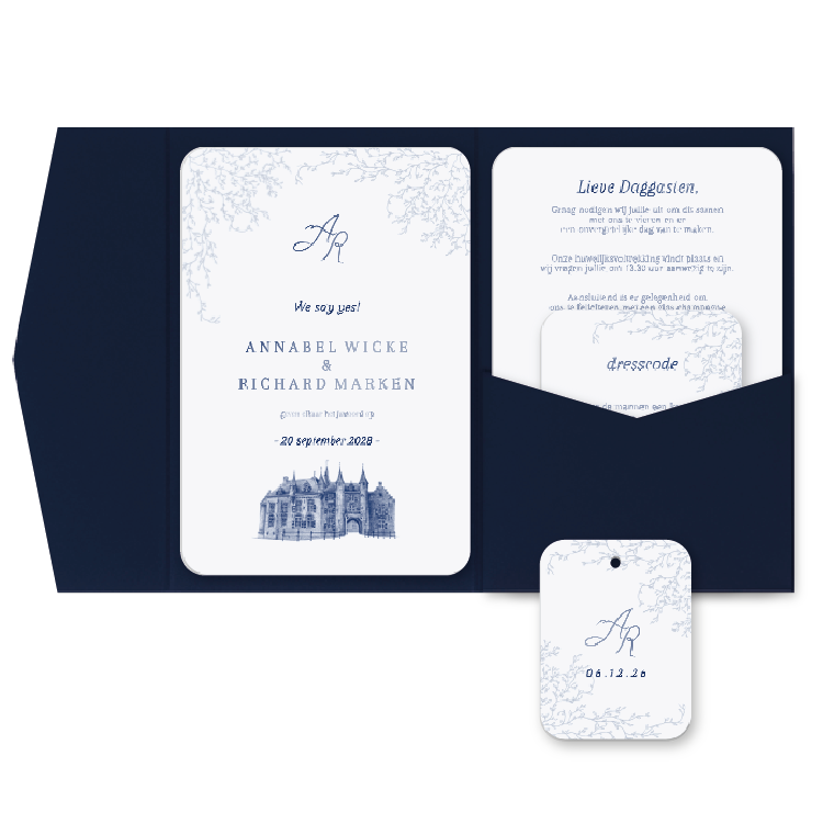 trouwkaart pocketfold blauwe takjes logo hoogglans trouwlocatie