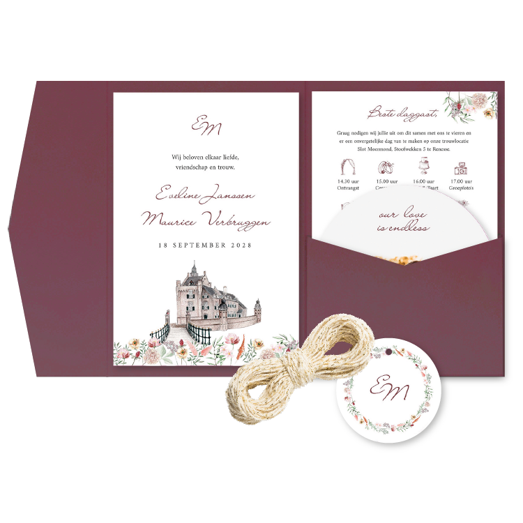 Elke trouwkaart wordt met de hand gemaakt en gedrukt op 300 grams papier. Daarnaast is deze pocketfold kaarten set voorzien van een hoofdkaart, zijkaart en een tweede zijkaart en daarnaast nog label, zodat je deze makkelijk kunt sluiten. Bestel vandaag nog je favoriete trouwkaart en maak je bruiloft onvergetelijk!