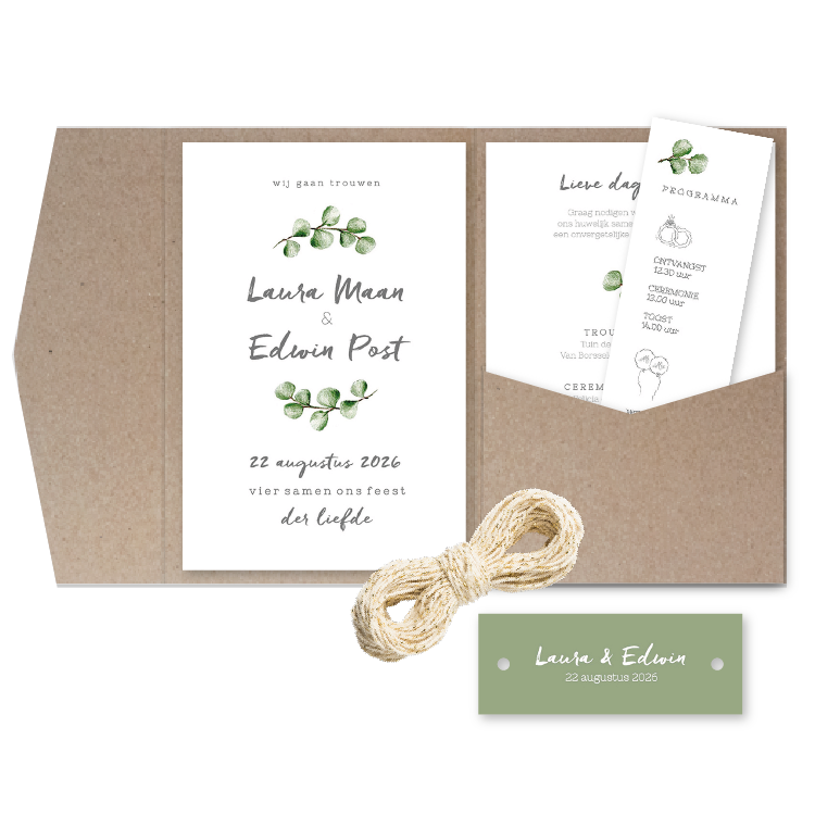Trouwkaart Pocketfold Eucalyptus Rond Groen: de perfecte uitnodigingskaart voor een kleurrijke bruiloft in elk seizoen! Deze hippe trouwkaart is voorzien van een uniek label en icoontjes, en is afgewerkt met goudfolie. Bestel vandaag nog en ontvang extra's bij je bestelling!