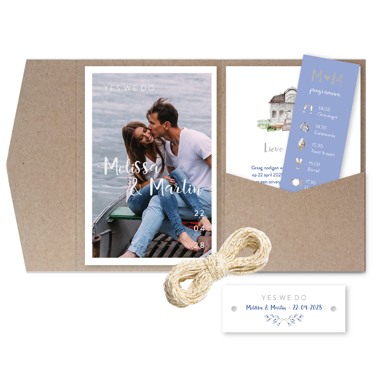 Daarnaast is deze pocketfold kaarten set voorzien van een hoofdkaart, zijkaart en een programmastrip en daarnaast nog labeltje die je gebruikt om de pocketfold te sluiten. Bestel vandaag nog je favoriete trouwkaart en maak je bruiloft onvergetelijk! ps. vergeet niet los een pocketfold mapje te bestellen.