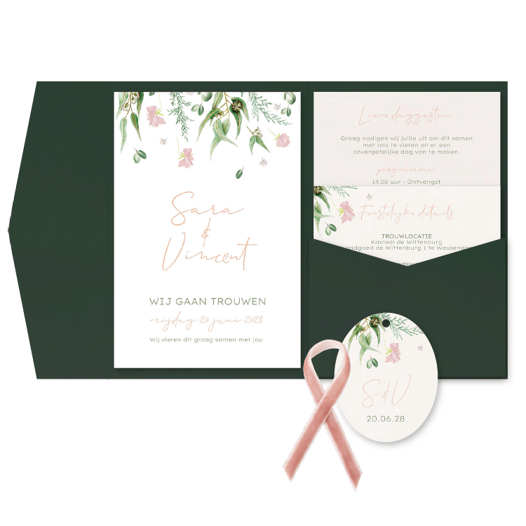 Deze prachtige pocketfold trouwkaart set is perfect voor een romantische bruiloft. De bloemen en takjes in het roze en groen zijn mooi getekend en geven de kaarten een prachtige uitstraling. Op het kleine label is een trouwlogo aangebracht, wat je ook terug kunt laten komen in de rest van je drukwerk. Elke trouwkaart in deze set is met de hand gedrukt en gesneden op 300 grams papier gedrukt. De set bestaat uit een hoofdkaart, zijkaart en een detailkaart en de kaart heeft ook een klein label, bestel los je lint erbij zodat je de pocketfold makkelijk kunt sluiten. Bestel vandaag nog je favoriete trouwkaart en maak je bruiloft onvergetelijk! Vergeet niet om los een pocketfold mapje te bestellen.