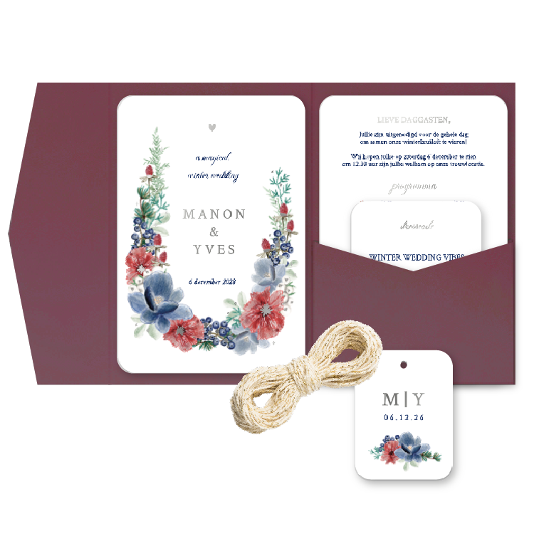 Trouwkaart pocketfold met een prachtige winter krans met witte besjes en verschillende tinten groene takjes met blauwe en rode bloemen. Deze set heeft een hoofdkaart, zijkaart, dresscode kaartje en labeltje.