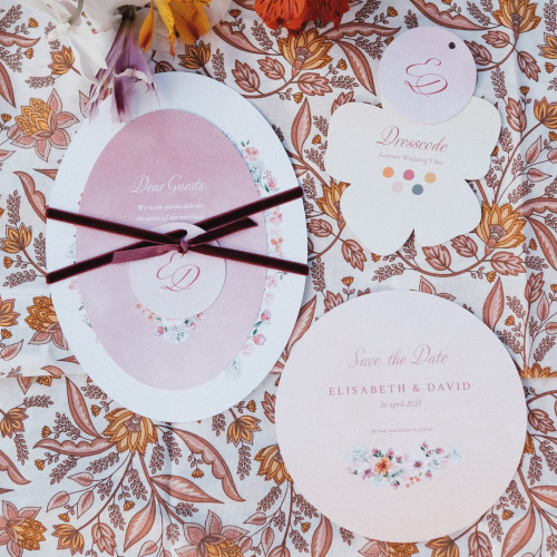 Trouwkaart pakketje bloemen krans roze oranje bestaand uit ovale kaart met een bloemenkrans een detailkaart met veel informatie en een dresscode kaartje in de vorm van een bloem. Hert labeltje bevestig je met lint vast aan de kaart. Het kaartje is verder afgewerkt met hoogglans folie. Vergeet geen lint mee te bestellen!