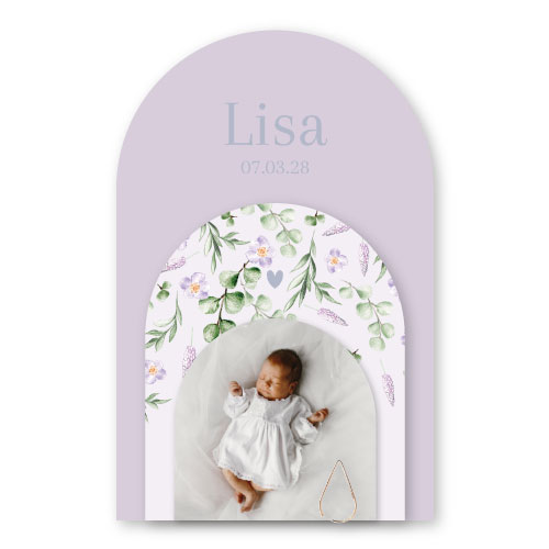 stapel meisjes geboortekaartje met foto, takjes en holografisch folie. Je kan de kaartjes met een paperclip bij elkaar klemmen of een touwtje gebruiken. De hoofdkaart is 11x17cm, de andere kaartjes hebben het formaat van 9x13 en 7.5x9.