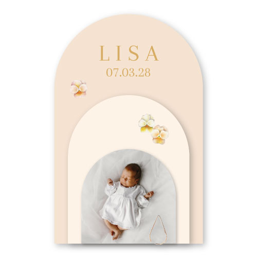 stapel meisjes geboortekaartje met foto, viooltjes en goudfolie. Je kan de kaartjes met een paperclip bij elkaar klemmen of een touwtje gebruiken. De hoofdkaart is 11x17cm, de andere kaartjes hebben het formaat van 9x13 en 7.5x9.