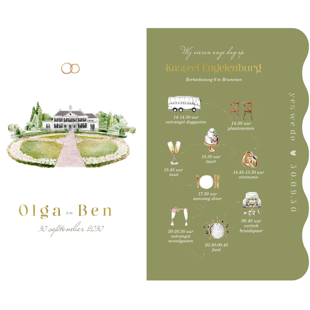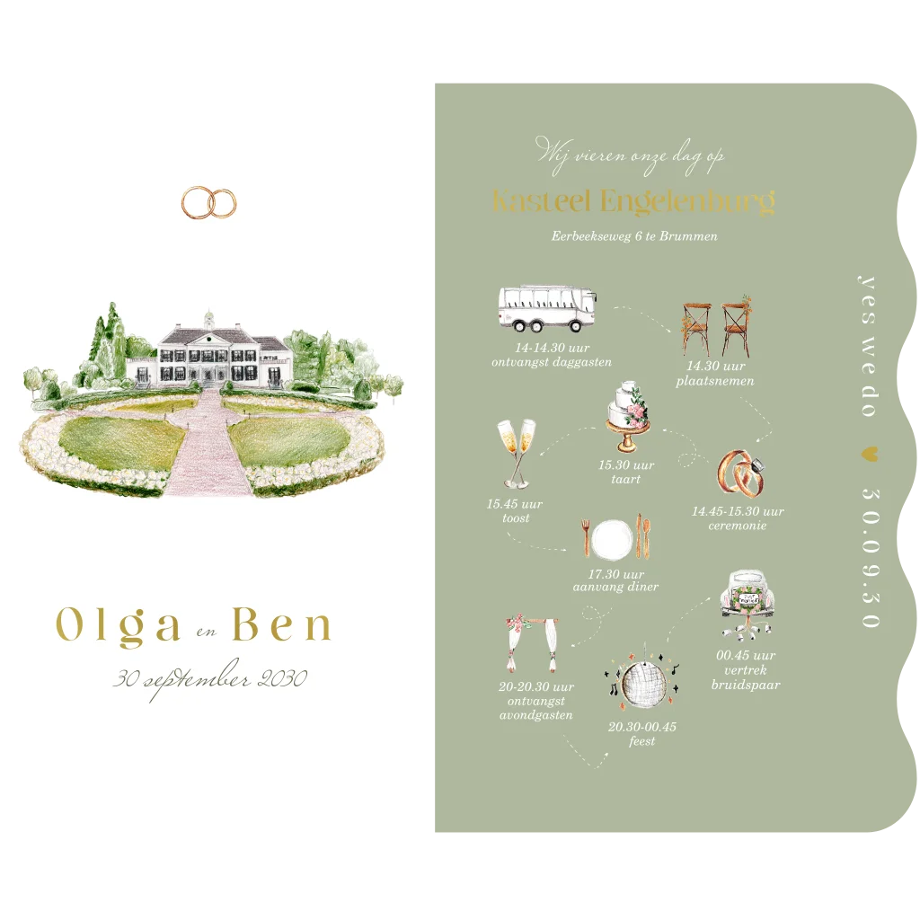Trouwkaart set trouwlocatie engelenburg golfvorm groen