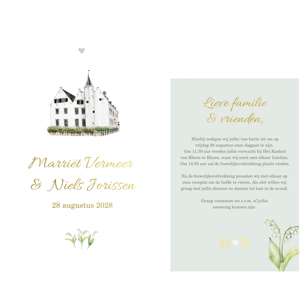 Op zoek naar een unieke trouwkaart set? Ontdek de trouwkaart trouwlocatie Kasteel van Rhoon met lelietje van dalen, compleet met een extra kaartje. De hoofdkaart is 11x17 en de kleine kaart 9x13,5, en met onze handige editor kun je eenvoudig de achtergrond aanpassen aan jouw favoriete kleur.