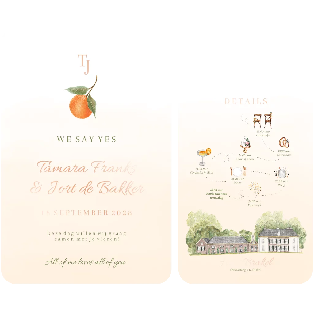 Op zoek naar een unieke trouwkaart setje met verloop en sinaasappels ? Ontdek de trouwkaart met getekende sinaasappels en icoontjes, compleet met een extra kaartje. De hoofdkaart is 11x17 en de kleine kaart 9x13,5, en met onze handige editor kun je eenvoudig de achtergrond aanpassen aan jouw favoriete kleur.