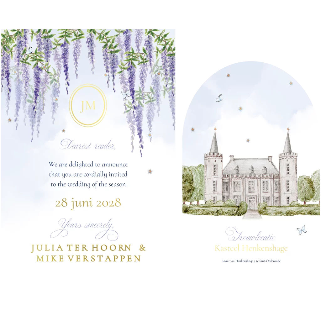 Op zoek naar een unieke trouwkaart in Brigerton stijl? Ontdek deze trouwkaart met getekende blauwe regen en goudfolie, compleet met een extra kaartje. De hoofdkaart is 11x17 en de kleine kaart 9x15.