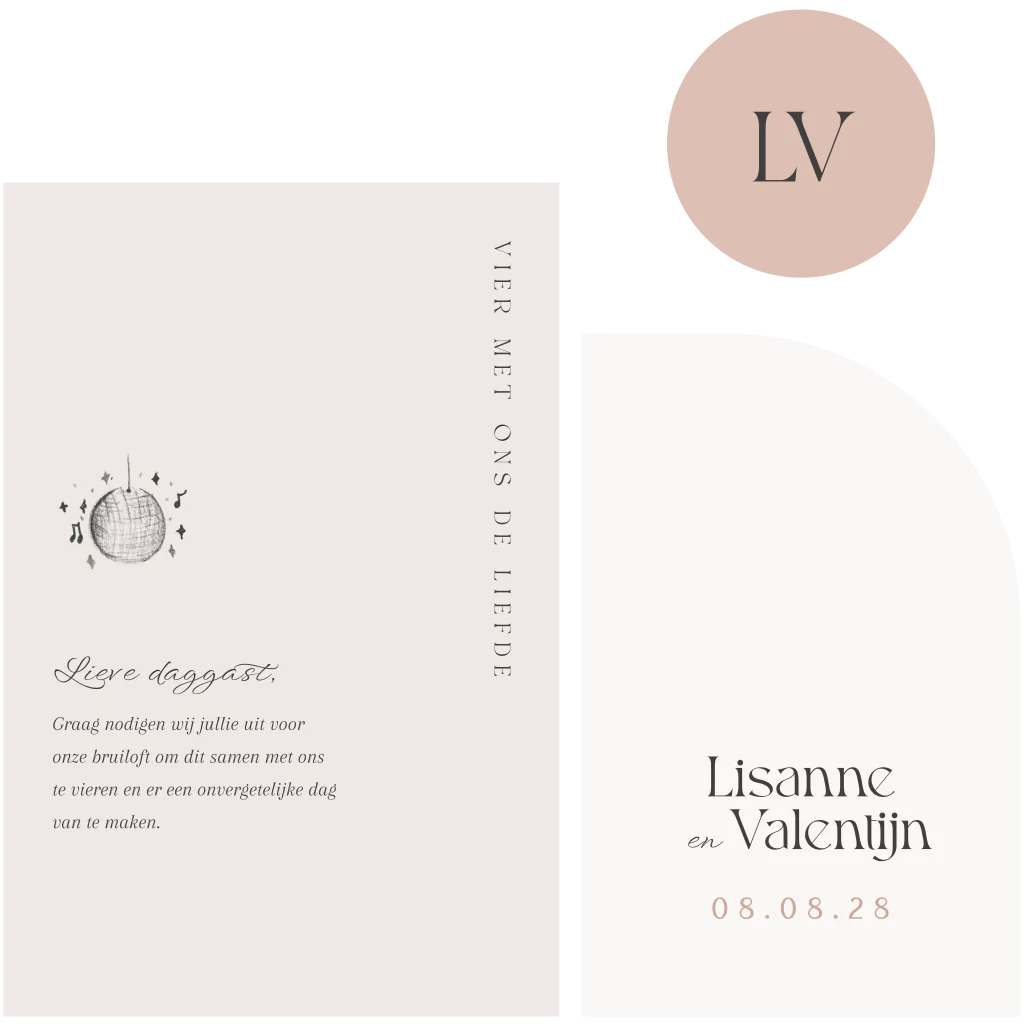 Klassieke trouwkaart met losse kaartjes. Er is een uitnodiging, programma en logo. Ook een getekende trouwlocatie kan je bij het programma terugvinden. Je kan de kaartjes met een paperclip bij elkaar klemmen of een touwtje gebruiken. De hoofdkaart is 11x17cm, de andere kaartjes hebben het formaat van 9x14 en 5.5 rond.