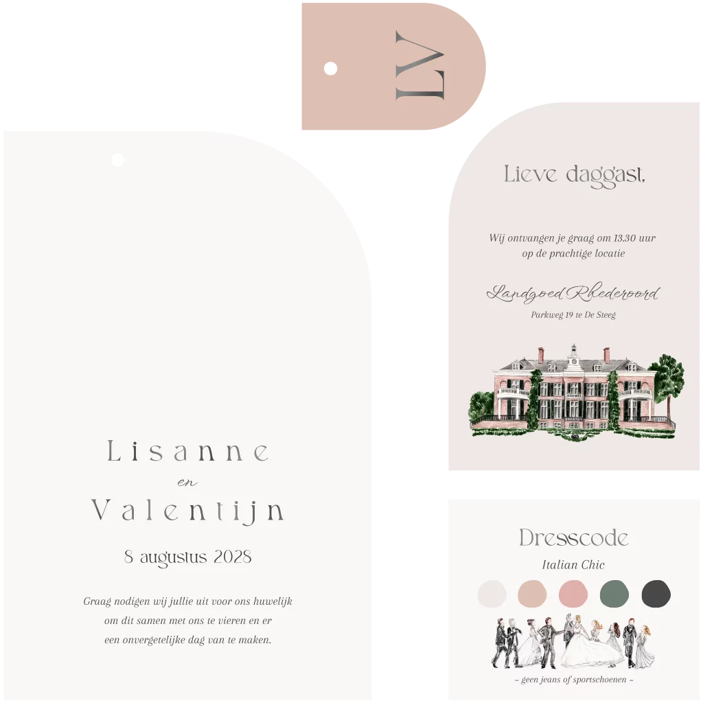 Klassieke trouwkaart met losse kaartjes. Er is een uitnodiging, programma en logo. Ook een getekende trouwlocatie van de locatie Landgoed Rhederoord kan je bij het programma terugvinden. Je kan de kaartjes met een paperclip bij elkaar klemmen en het logo labeltje met een stukje lint eraan bevestigen. De hoofdkaart is 11x17cm, de andere kaartjes hebben het formaat van 7.5x11, 7.5x6 en 5.5x3.8cm.