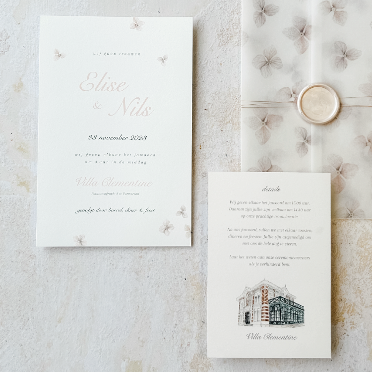 Wil je de kaart in een ander formaat of heb je behoefte aan een bijpassend kaartje? Alles is mogelijk! Neem contact met ons op via mail of telefoon, en wij helpen je graag verder. Laat jullie uitnodiging een weerspiegeling zijn van jullie persoonlijkheid en stijl. Ontdek de mogelijkheden van deze hortensia trouwkaart en maak jullie aankondiging extra bijzonder.