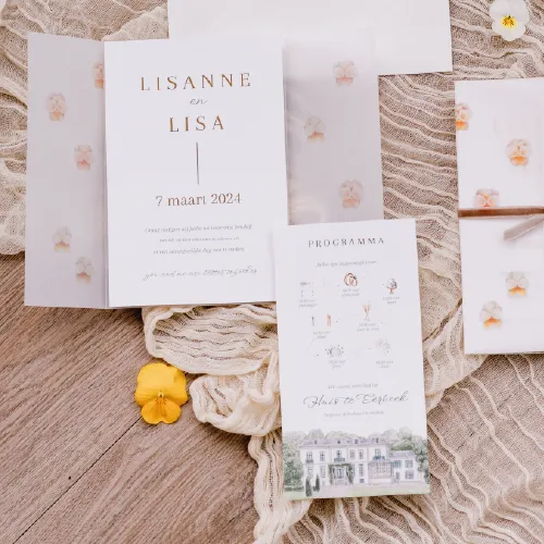 Wil je de kaart in een ander formaat of heb je behoefte aan een bijpassend kaartje? Alles is mogelijk! Neem contact met ons op via mail of telefoon, en wij helpen je graag verder. Laat jullie uitnodiging een weerspiegeling zijn van jullie persoonlijkheid en stijl.