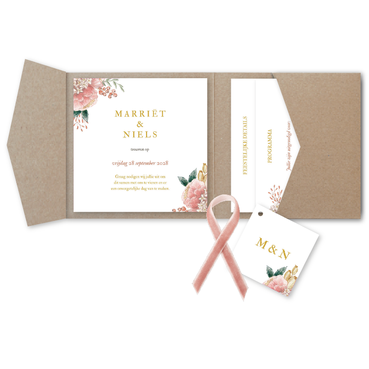 Pocketfold Trouwkaart bloemen peach oker roze