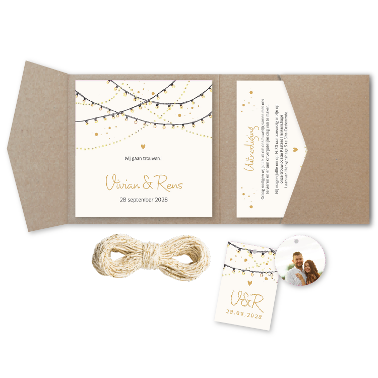 Zin in jullie festival bruiloft met deze Pocketfold Trouwkaart met lampjes en afgewerkt met folie! De warme kleurencombinatie van goud, creme en kraft geeft deze bruiloftsuitnodiging een feestelijke uitstraling. Bovendien kun je deze uitnodiging personaliseren met een foto van jullie.